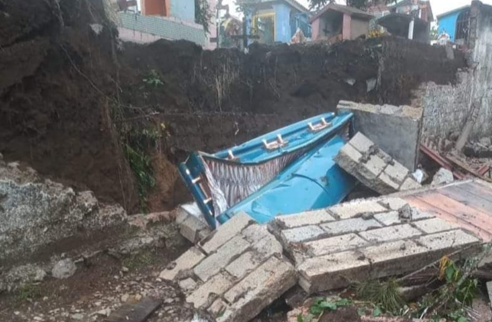 Debido a la descarga pluvial, una de las bardas del camposanto se vino abajo, arrastrando parte de la tierra, lo que provocó que un féretro qué hace poco había sido depositado, quedara expuesto.