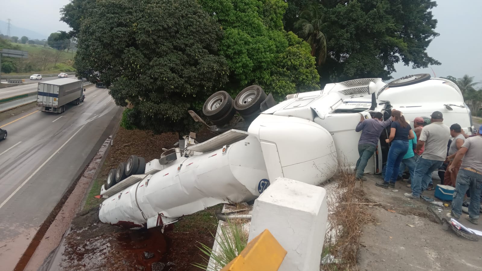 El contenedor de melaza se salió de la carretera y cayó a un costado de la autopista, mientras que el chofer quedó atrapado en la cabina, la cual estaba a punto de ser arrastrada por el peso de la carga.