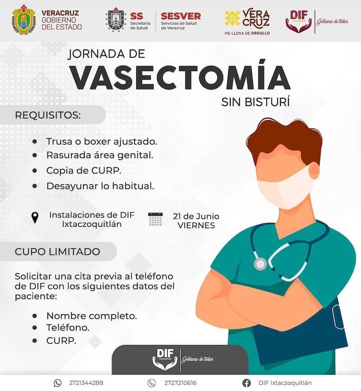 Al respecto, la directora del DIF de Ixtaczoquitlán, Digna Isela Luna Gutiérrez, invitó a los hombres del municipio que, estén interesados en ser parte de la jornada de Vasectomías sin bisturí, la cual, afirmó que, es segura, permanente y gratuita. Recalcó que, el cupo es limitado.