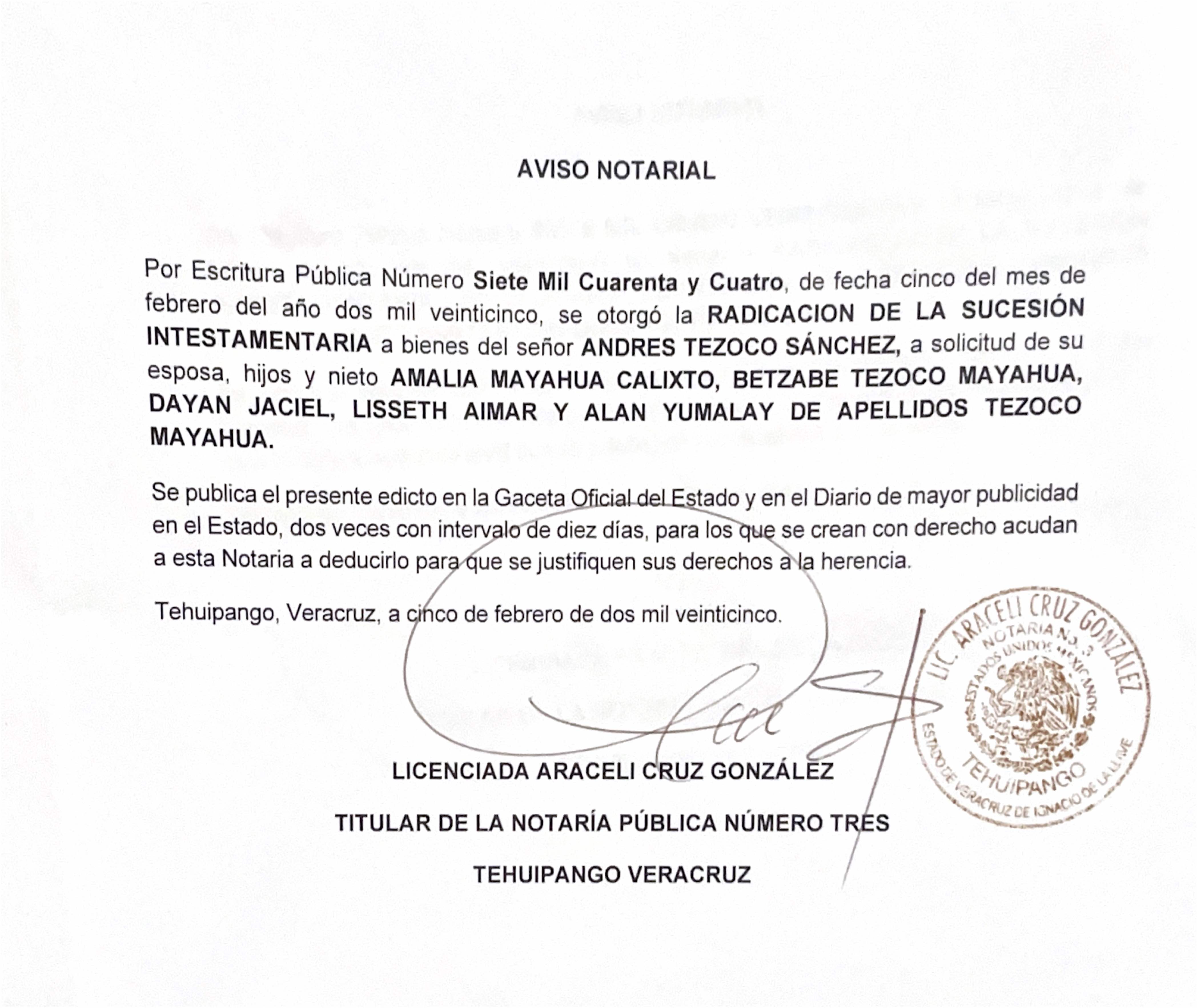Aviso Notarial Andrés Tezoco Sánchez