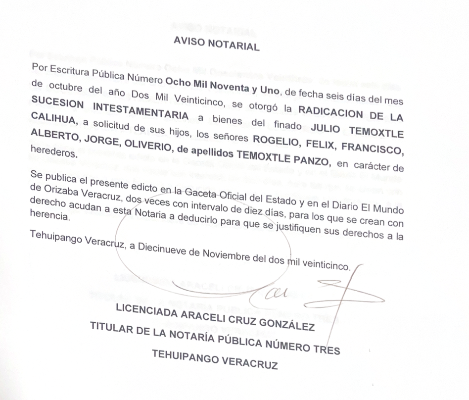 Aviso Notarial Julio Temoxtle Calihua