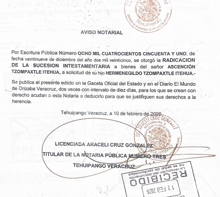 Aviso Notarial Ascención Tzompaxtle Itehua