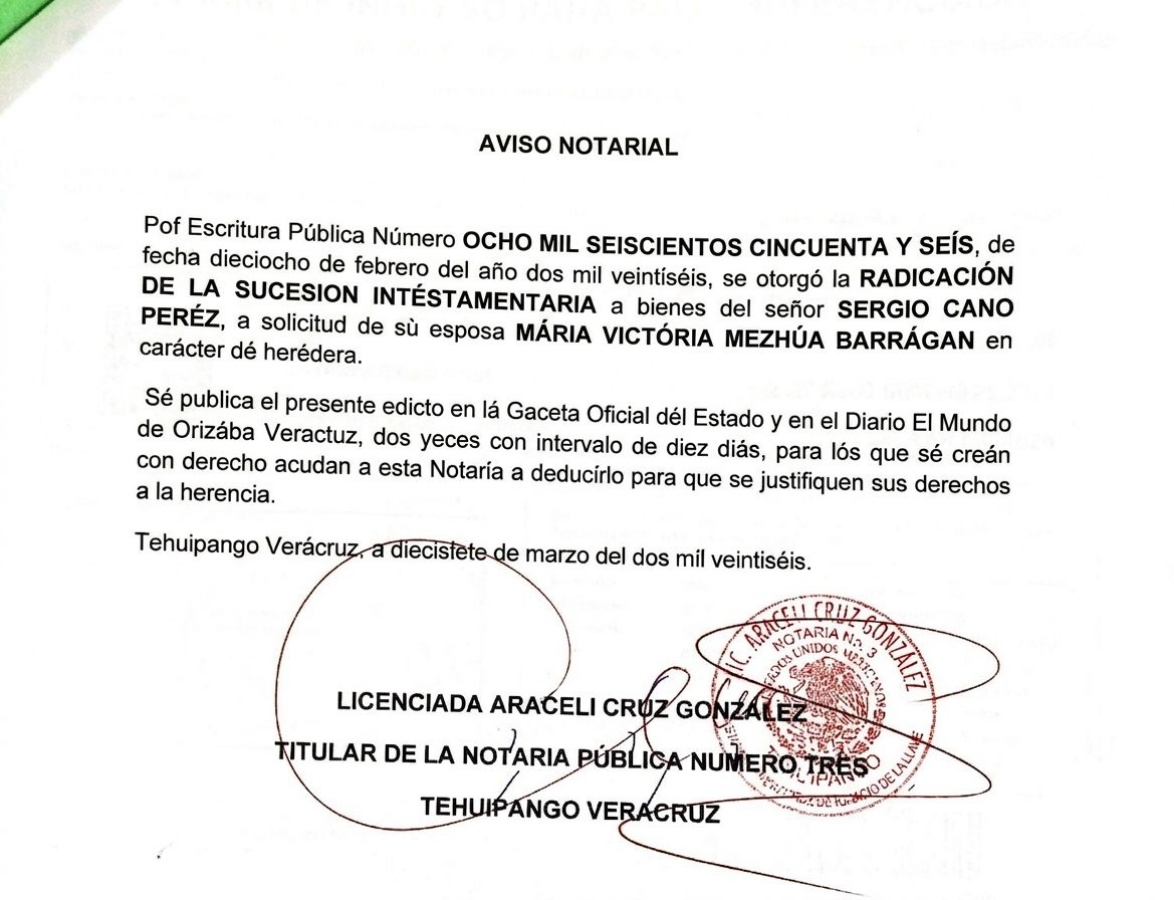 Aviso Notarial Sergio Cano Pérez