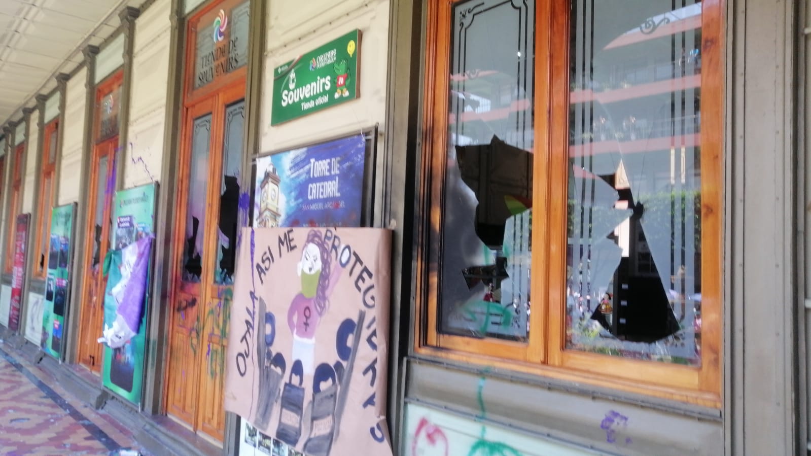 Ahí, un grupo de mujeres encapuchadas rompieron la puerta principal de cristal templado, igual hicieron con ventanas y dejaron pintas y pancartas, tanto en la fachada como en exteriores.