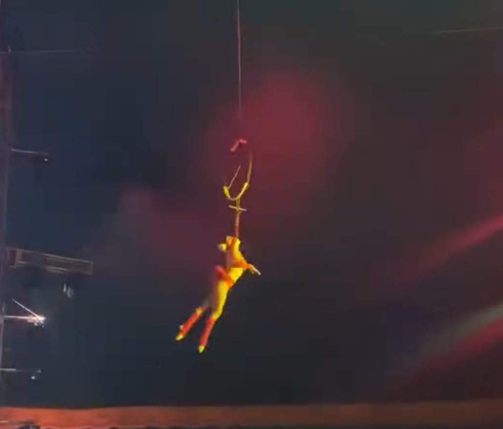 La también gimnasta realizaba una danza aérea apoyada con un aro de acero, sin embargo, en una de las maniobras perdió el equilibrio y cayó de casi cuatro metros.
