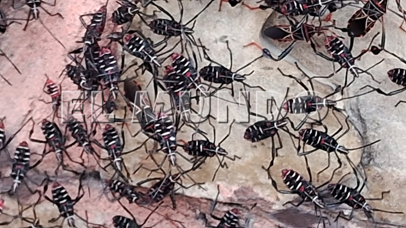 Sobre la banqueta y una barda particular de la avenida Ruiz Galindo, fue hallada una inusual plaga de insectos, que de acuerdo a expertos en biología y al registro de coleopteros se trata de chinches gigantes del mezquite, cuyo nombre científico es Thasus gigas.