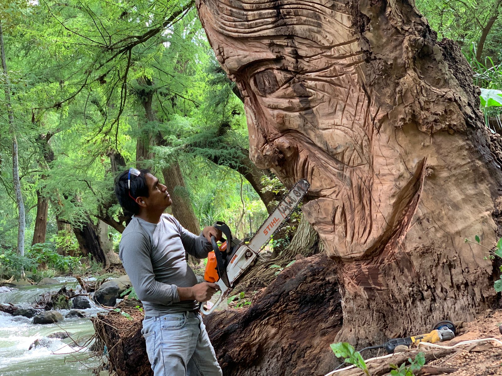 “Nunca cortamos una rama de árboles vivos, trabajamos únicamente con lo que ya está muerto o ha caído de manera natural”, aclaró Miguel Ángel Rosas, “hace varios años comenzamos este proyecto con esculturas talladas en madera de ahuehuetes, ubicadas en la Piedra Móvil y otros espacios de la región”.