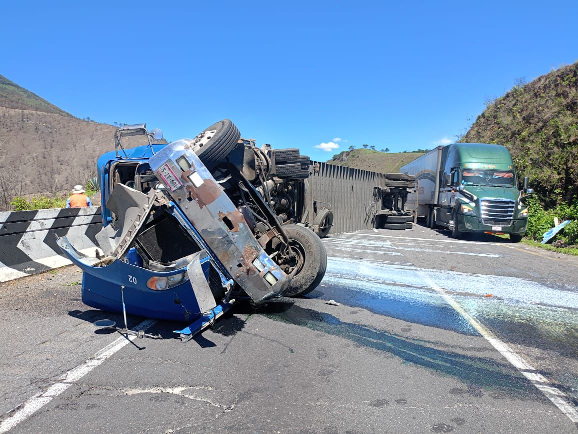 Maltrata. -Un tráiler que se quedó sin frenos hoy por la tarde, cuando se desplazaba sobre la autopista Puebla-Orizaba, a la altura del Trébol de Maltrata, chocó contra un automóvil particular y posteriormente volcó.