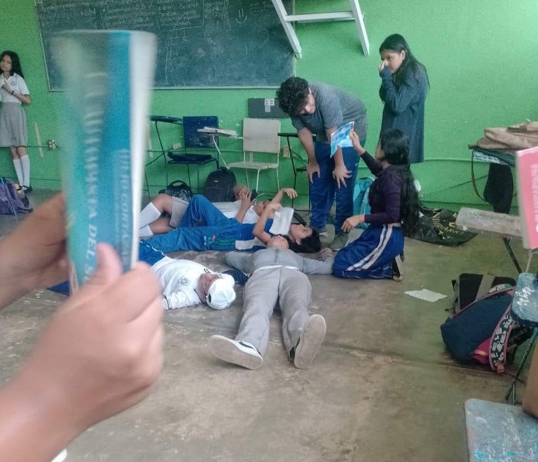 Los estudiantes del grupo segundo 'D' relataron que el profesor impidió que abrieran las puertas y ventanas del aula, negándoles también el encendido del aire acondicionado. Las imágenes compartidas en redes sociales muestran a varios alumnos en el suelo, a punto del desmayo, mientras otros intentaban refrescarlos con libretas y cartones.