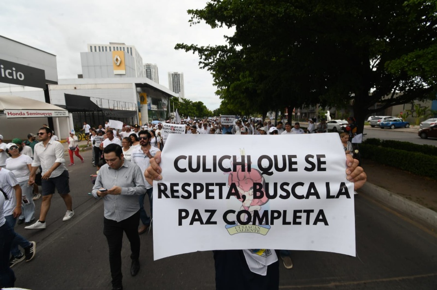 Varios asistentes durante el trayecto de la plaza Cuatro Ríos hasta la Isla de Oraba corearon “culichi que se respeta quiere la paz completa”, entre otras consignas alusivas a la paz.