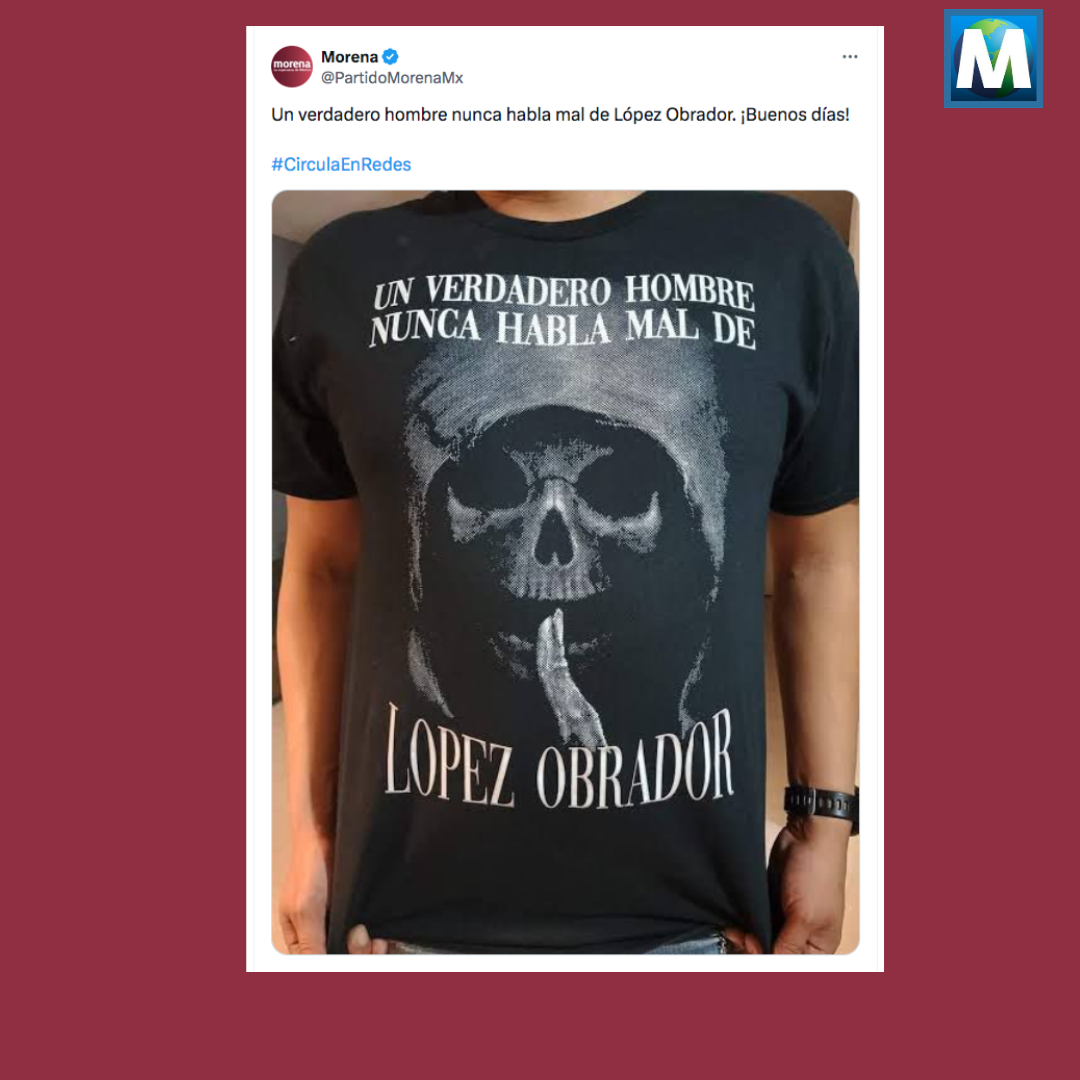 En la cuenta oficial de X, antes Twitter, de Morena, se observa una imagen de una playera con la imagen de una calavera, que muchos interpretaron como la imagen de la Santa Muerte con una frase en apoyo al presidente de la República, Andrés Manuel López Obrador, lo que generó múltiples críticas de los usuarios de la plataforma, tanto por la imagen religiosa como a la frase, que calificaron de “machista”.