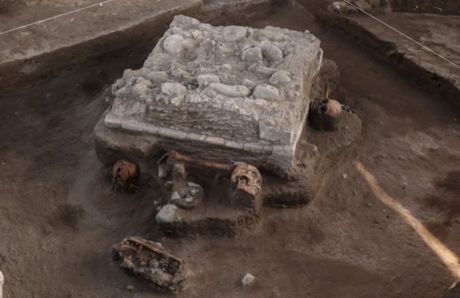 En el sitio se hallaron al menos cuatro cráneos y huesos largos, posiblemente fémures, colocados como ofrendas en los bordes del altar. Uno de los cráneos incluso podría conservar unión con la columna, lo que abre la posibilidad de confirmar prácticas de decapitación ritual.