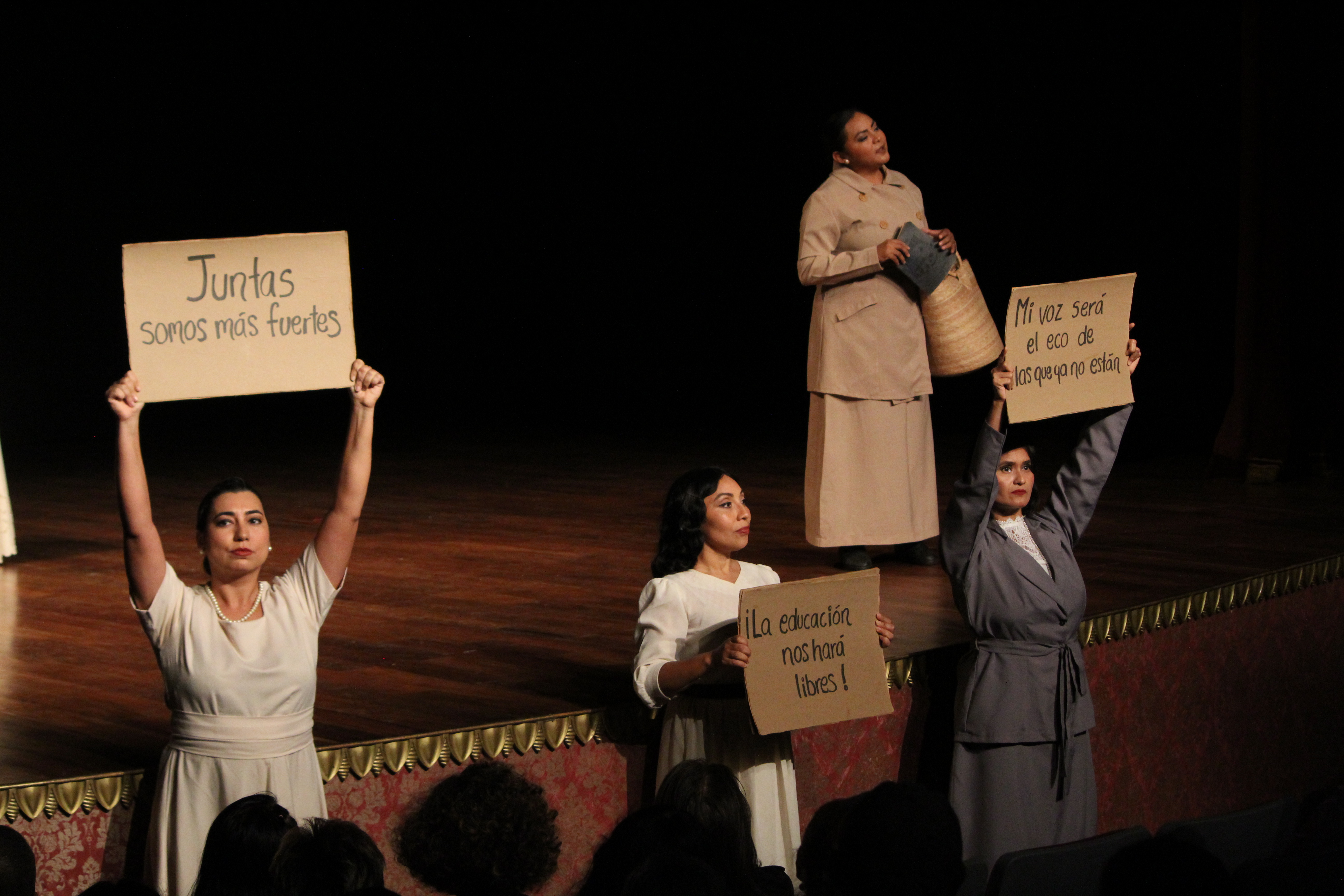 Las actrices en escena narraron cómo Rosa Torre González, Elvia Carrillo Puerto, Beatriz Peniche Barrera y Raquel Dzib Cicero rompieron barreras casi 30 años antes de que el voto femenino se institucionalizara en México. Contra todos los pronósticos, estas cuatro yucatecas ocuparon cargos políticos en una época en la que las mujeres ni siquiera podían votar.