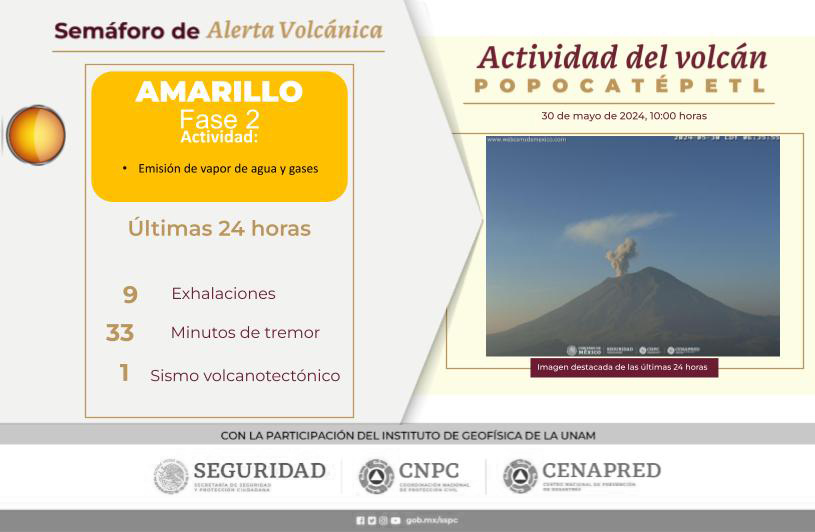 La Coordinación General de Protección Civil del Estado de Puebla, informó que de acuerdo con la información del Centro Nacional de Prevención de Desastres (CENAPRED), en las últimas 24 horas, el volcán Popocatépetl ha emitido 9 exhalaciones acompañadas de vapor de agua, gases volcánicos y ligeras cantidades de ceniza, 33 minutos de tremor y un sismo volcanotectónico de magnitud 1.5.