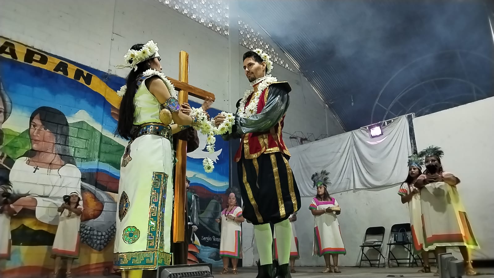Mediante danzas, música azteca, maya, prehispánica, la puesta en escena tuvo lugar en el auditorio de la cabecera municipal, cautivando. Los asistentes.