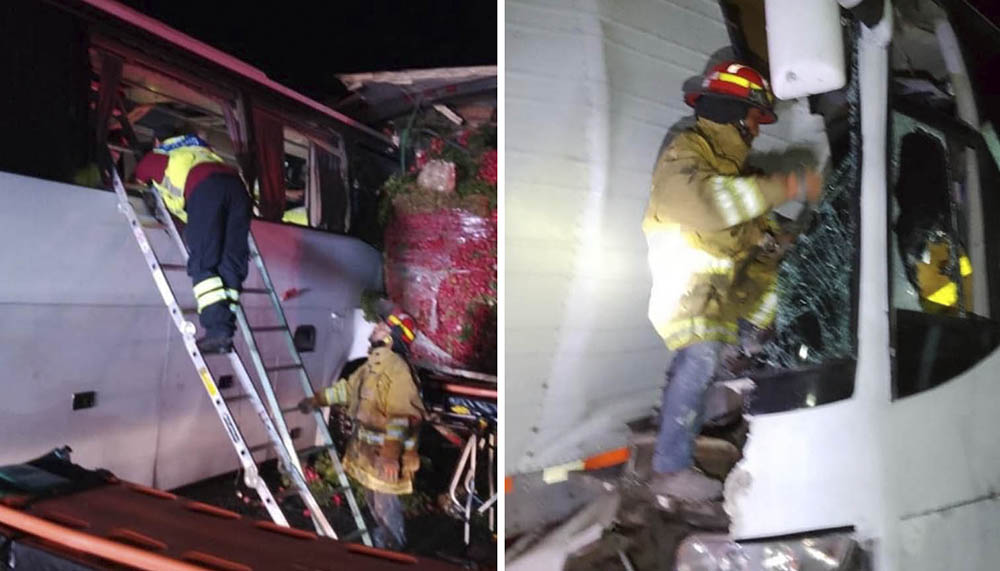 Tras el impacto, otro autobús embistió al Volvo, el cual volvió a incrustarse contra la caja seca del tractocamión, cuyo operador se detuvo.