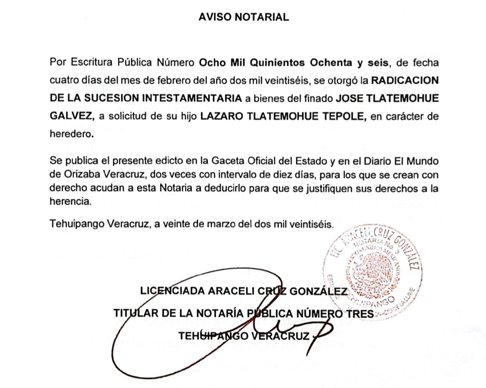 Aviso Notarial José Tlatemohue Galvez