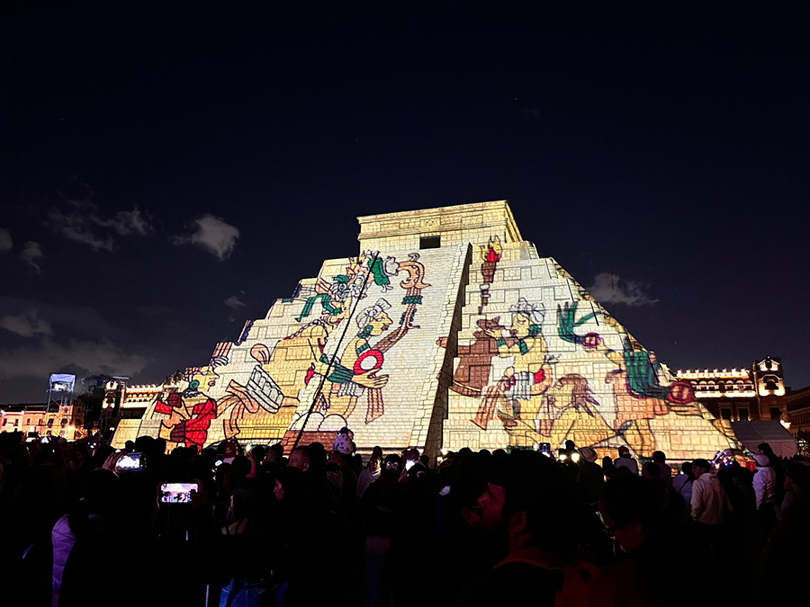 El encendido de la réplica de la Pirámide de Kukulkán, se llevó a cabo la noche de este sábado en el Zócalo de la Ciudad de México ante 80 mil asistentes.