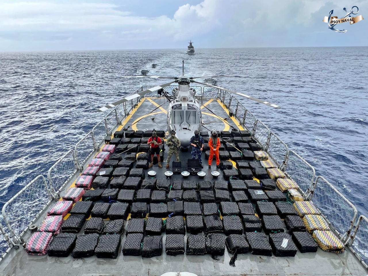 En un primer evento, al suroeste de Manzanillo, Colima, personal naval a bordo del buque ARM “Godínez” (PO-132) y con apoyo de un helicóptero tipo Panther, aseguró tres embarcaciones menores con tres motores fuera de borda cada una, 126 bultos con un peso aproximado de 5.6 (cinco punto seis) toneladas de presunta cocaína; lo cual representa la mayor incautación en un solo evento durante la presente administración; y aproximadamente 1,100 (mil cien) litros de combustible. Así como, la puesta a disposición de 15 presuntos transgresores de la ley.