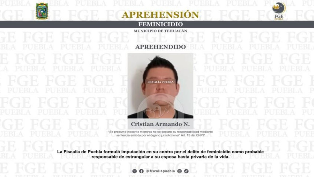 En horas recientes la Fiscalía General de Puebla (FGE), informó que aprendió a Cristian Armando N., como probable responsable del feminicidio de su esposa, a quien presuntamente estranguló al interior de su domicilio en Tehuacán, por lo cual permanece en prisión preventiva.