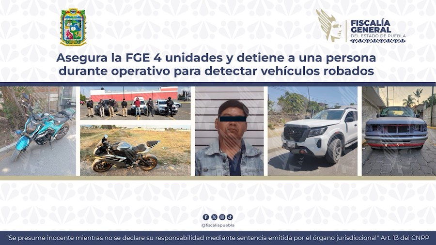 Un total de cuatro vehículos asegurados y una persona detenida fue el resultado de un operativo encabezado por la Fiscalía General del Estado en coordinación con la Guardia Nacional y la Secretaría de Seguridad Ciudadana para detectar vehículos robados en la ciudad de Puebla.